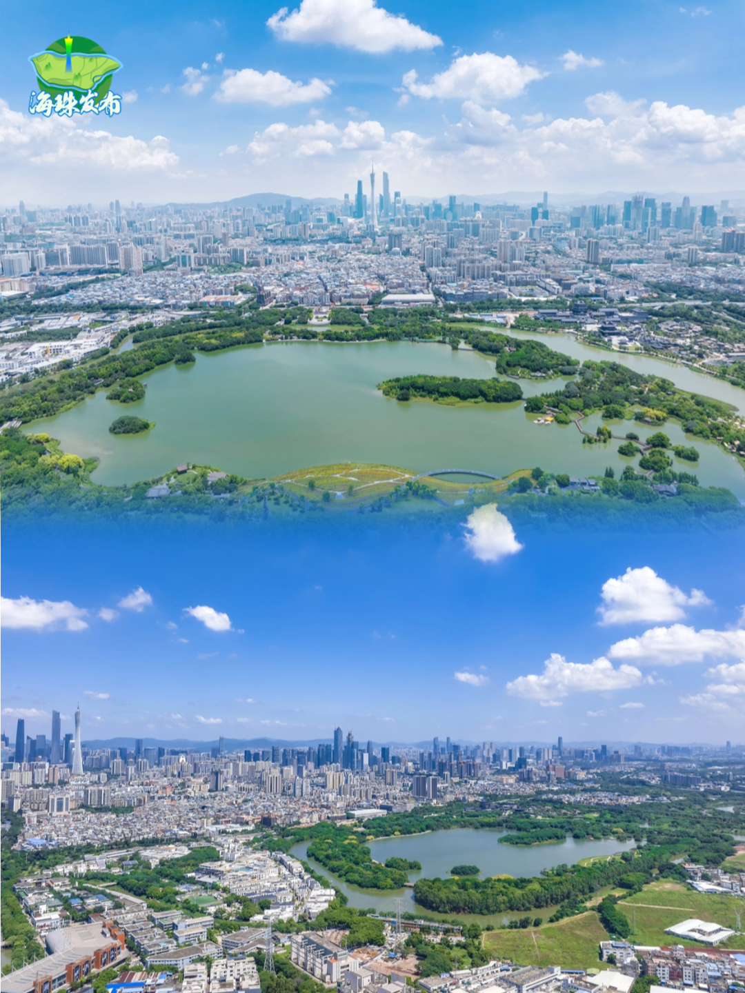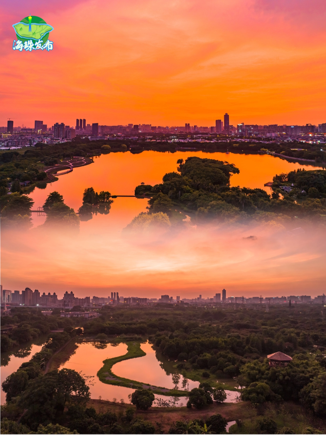随着太阳逐渐升高,天空转为清澈的天蓝色,整座城市都变得明亮起来,海珠湿地更显生机勃勃,灵动非凡。